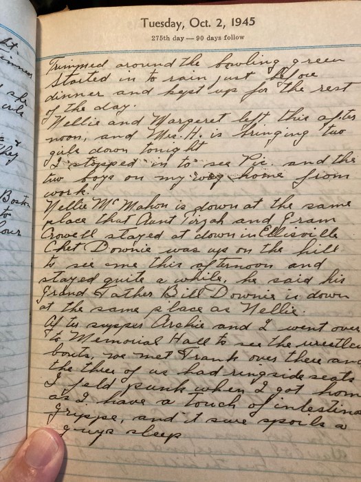After supper Archie and I went over to Memorial Hall to see the wrestling bouts, we met Frank over there and the three of us had ringside seats.