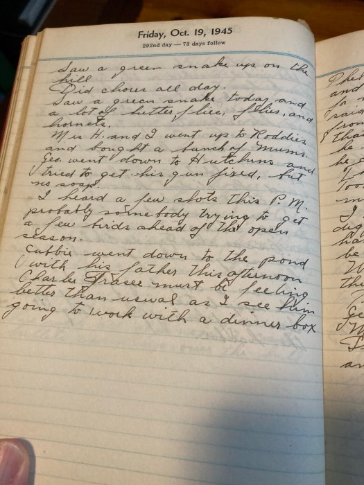 Saw a green snake up on the hill.