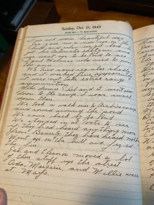 Geo gave me a ride up on the hill and when we got bak he got his Automatic shotgun and we went up to So Pond to see Danl Holmes who used to own the gun.