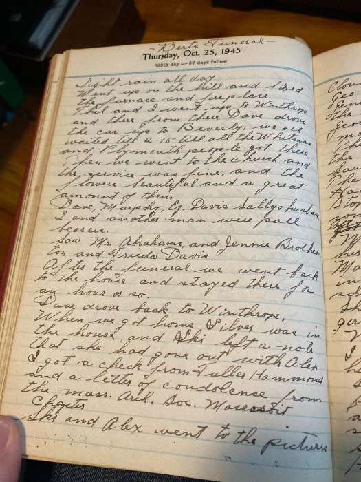 Thel and I went up to Winthrop and there from there Dave drove the car up to Beverly, we all waited till 2-15 all the Whitmans and Plymouth people got there.
