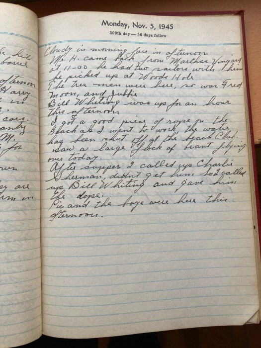 Mr H came back from Martha’s Vineyard at 11-30. He had two sailors with him he picked up at Woods Hole.