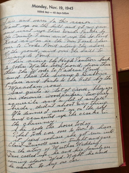 Went up on the hill and got my gun and went up thru Ward’s Pasture by the County Farm and up the So Pond Road as far as the Town Forest, then over to Cooks Pond along the shore of the pond and over the hill to Triangle Pond.