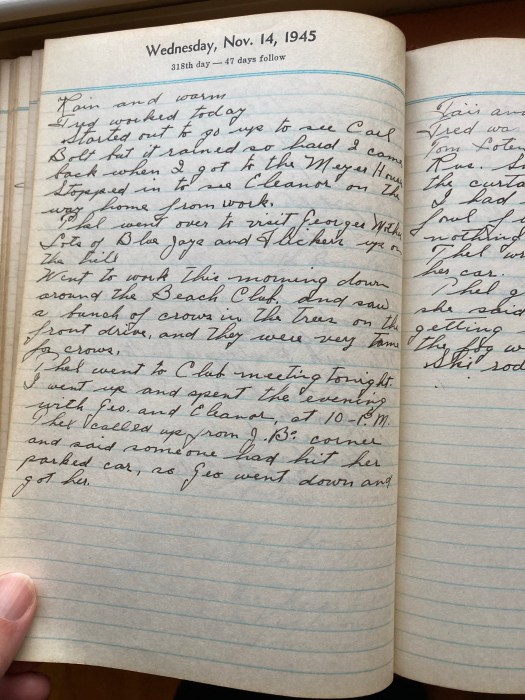 I went up and spent the evening with Geo and Eleanor, at 10 PM Thel called up from JBs corner and said someone had hit her parked car, so Geo went down and got her.