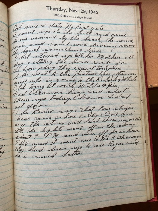 The radio says that four ships have come ashore on Cape Cod, and says the storm will last thru tomorrow. All the lights went off in the storm about 9 P.M. and were off for an hour.
