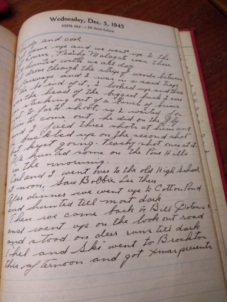 Carl drove through the strips of woods between the fairways and I was in a sand trap at the end of it. I looked up and there was the head of the biggest buck I ever saw sticking out of a bunch of briars just too far to shoot, so I waited for him to come out. He did on the fly and I fired three shots at him and he buckled up on the second shot but kept going. Peachy shot once at it.
