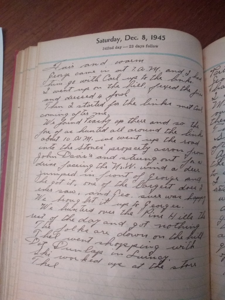 We found Peachy up there and so the four of us hunted all around the links. About 10 A.M. we went up the road into the Stones’ property across from John Davis’s and strung out for a drive facing the N.W. wind. A deer jumped in front of George and he got it, one of the largest does I ever saw, and George sure was happy. We brought it up to Georges.