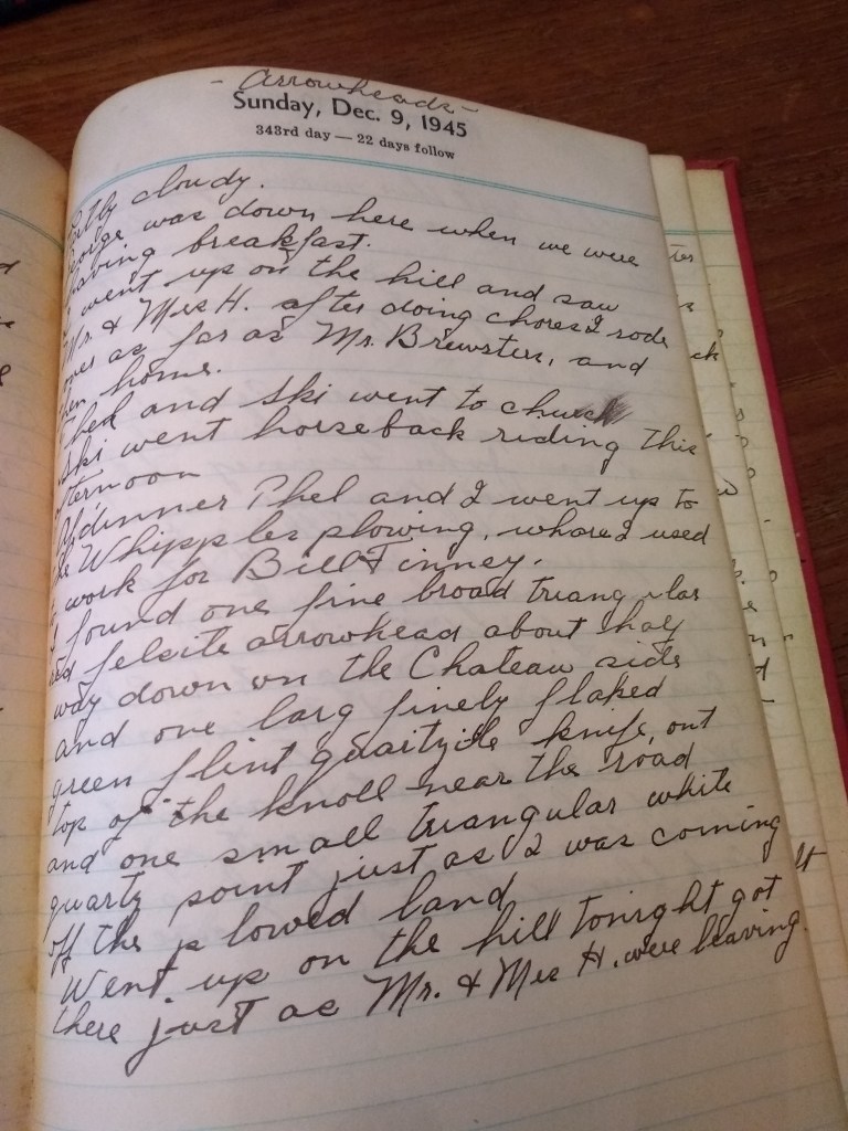 After dinner Phil and I went up to the Whipples plowing, where I used to work for Bill Finney. I found one fine broad triangular red felsite arrowhead about half way down on the Chateau side and one large finely flaked green flint quartzite knife out top of the knoll near the road and one small triangular white quartz point just as I was coming off the plowed land.