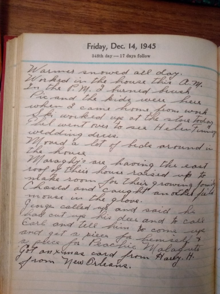George called up and said he had cut up his deer and to call Carl and tell him to ome up and get a piece for himself and a piece for Peachie Malaguti.