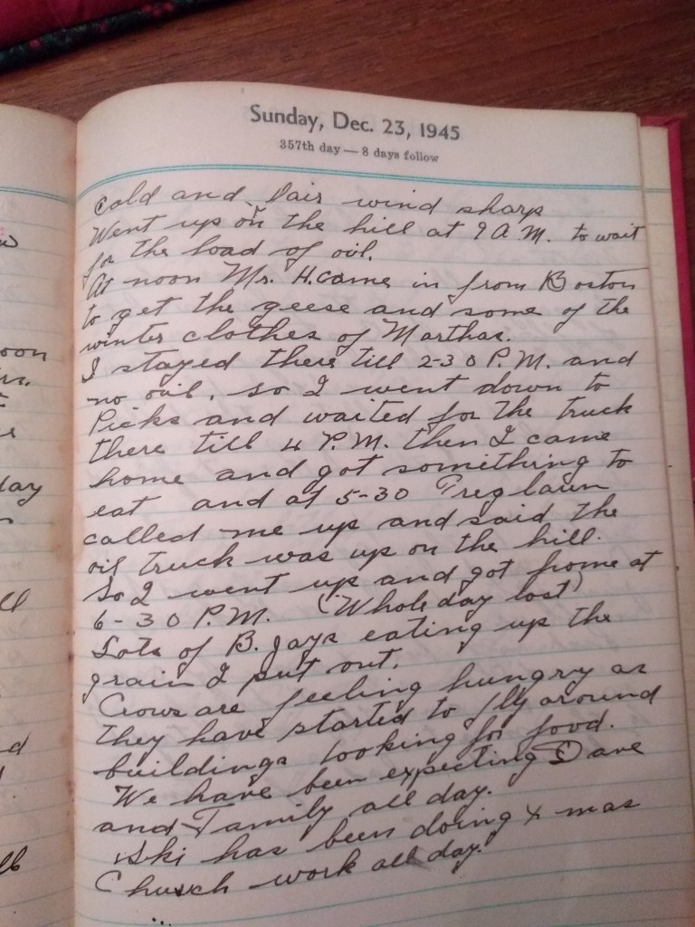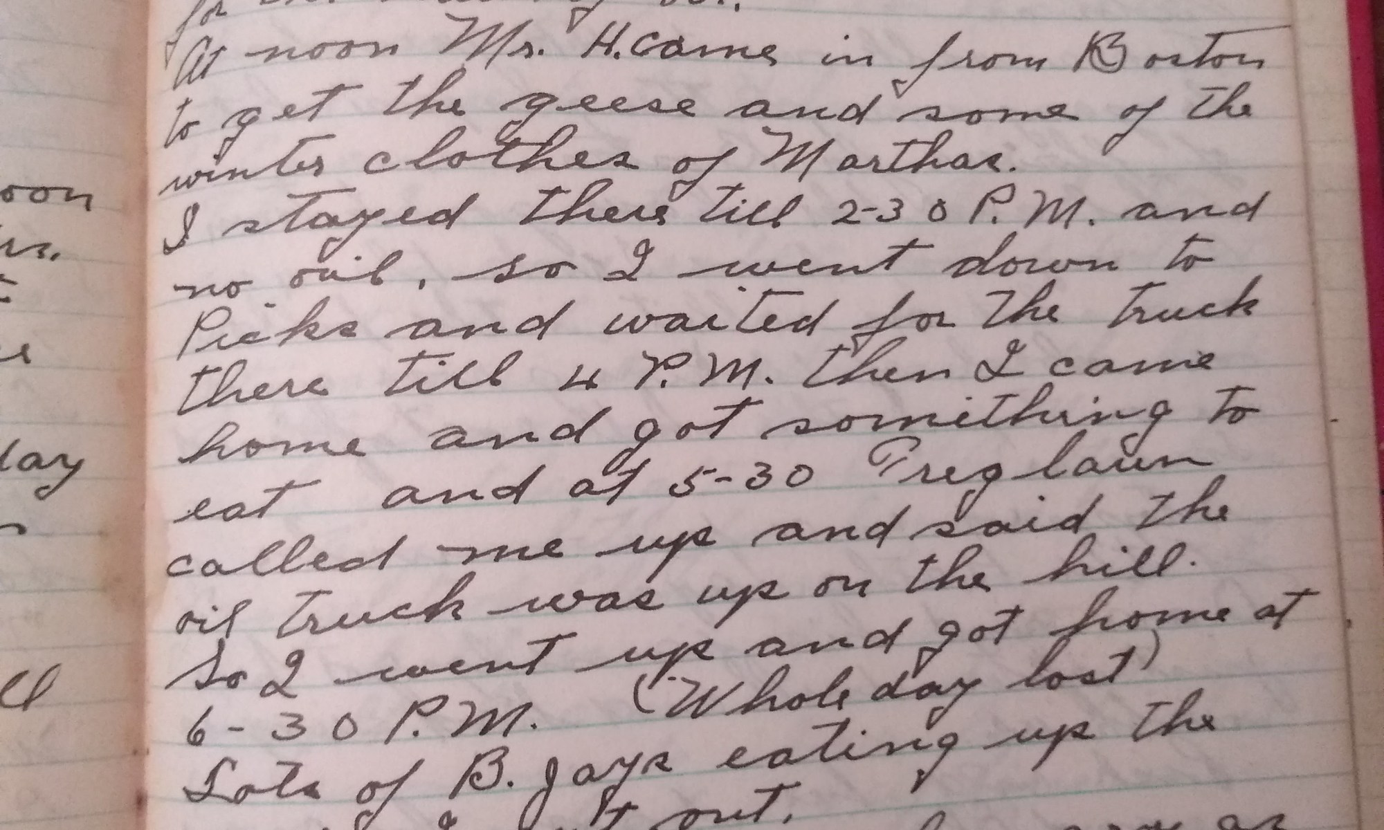 I stayed there till 2:30 P.M. and no oil, so I went down to Picks and waited for the truck there till 4 P.M. then I came home and got something to eat and at 5:30 Treglawn called me up and said the oil truck was up on the hill. So I went up and got home at 6:30 P.M. (Whole day lost)