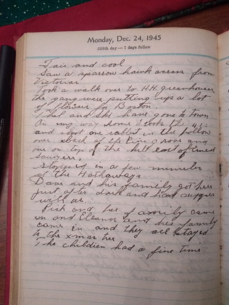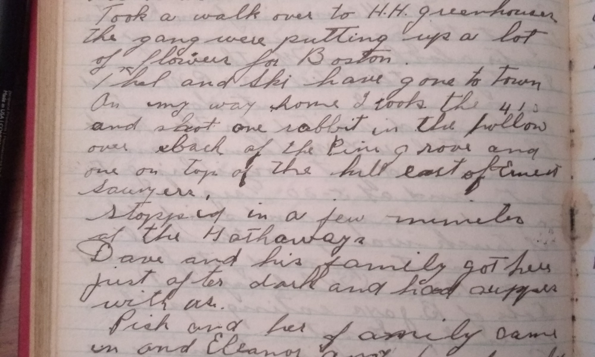 On my way home I took the 410 (?) and shot one rabbit in the hollow over back of the pine grove and one on top of the hill east of Ernest Sawyers.