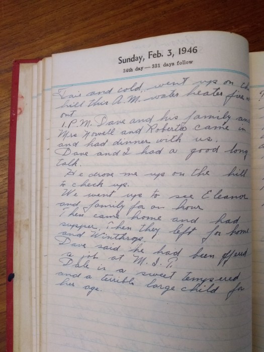 1 P.M. Dave and his family and Mrs. Nowell and Roberta came in and had dinner with us.