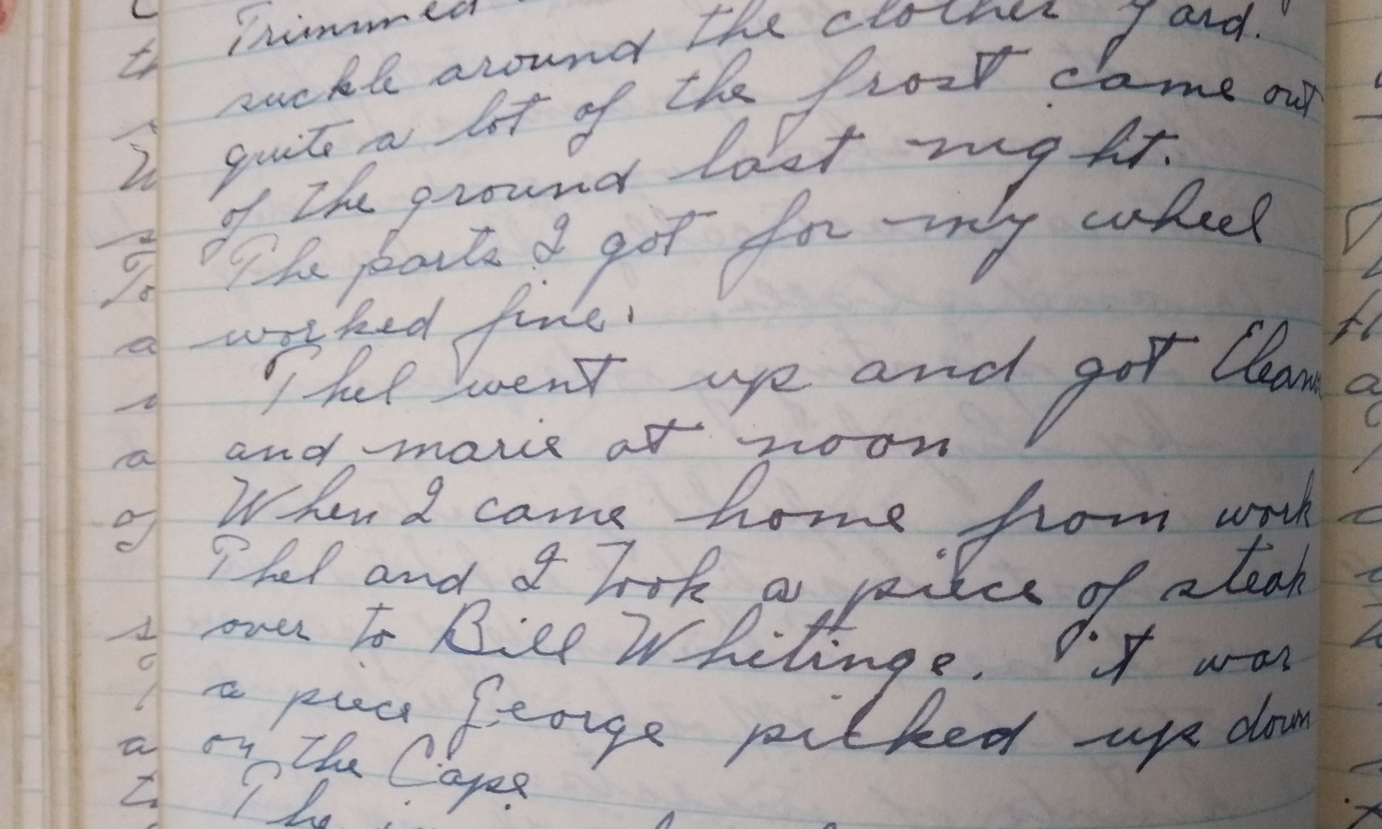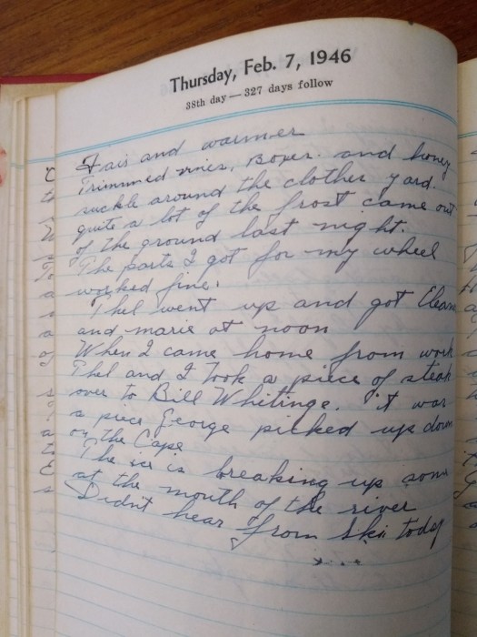 When I came home from work Thel and I took a piece of steak over to Bill Whitings. It was a piece George picked up down on the Cape.