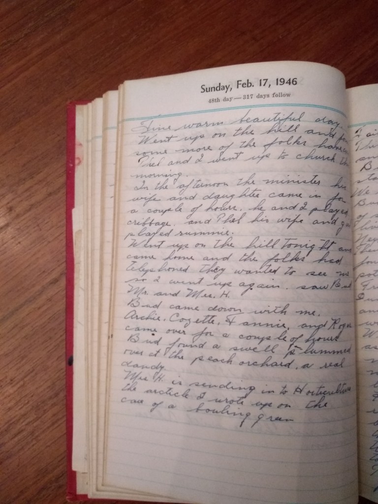 In the afternoon the minister, his wife, and daughter came for a couple of hours. He and I played cribbage and Thel and his wife and girl played rummy.