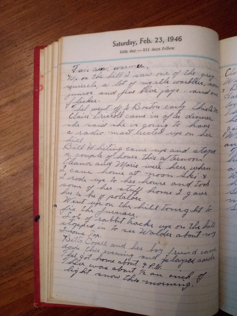Bill Whiting came up and stayed a couple of hours this afternoon. Eleanor and Marie were here when I came home at noon. Ski and I rode up to her house and took some of her stuff home. I gave her ½ bu. Of potatoes.