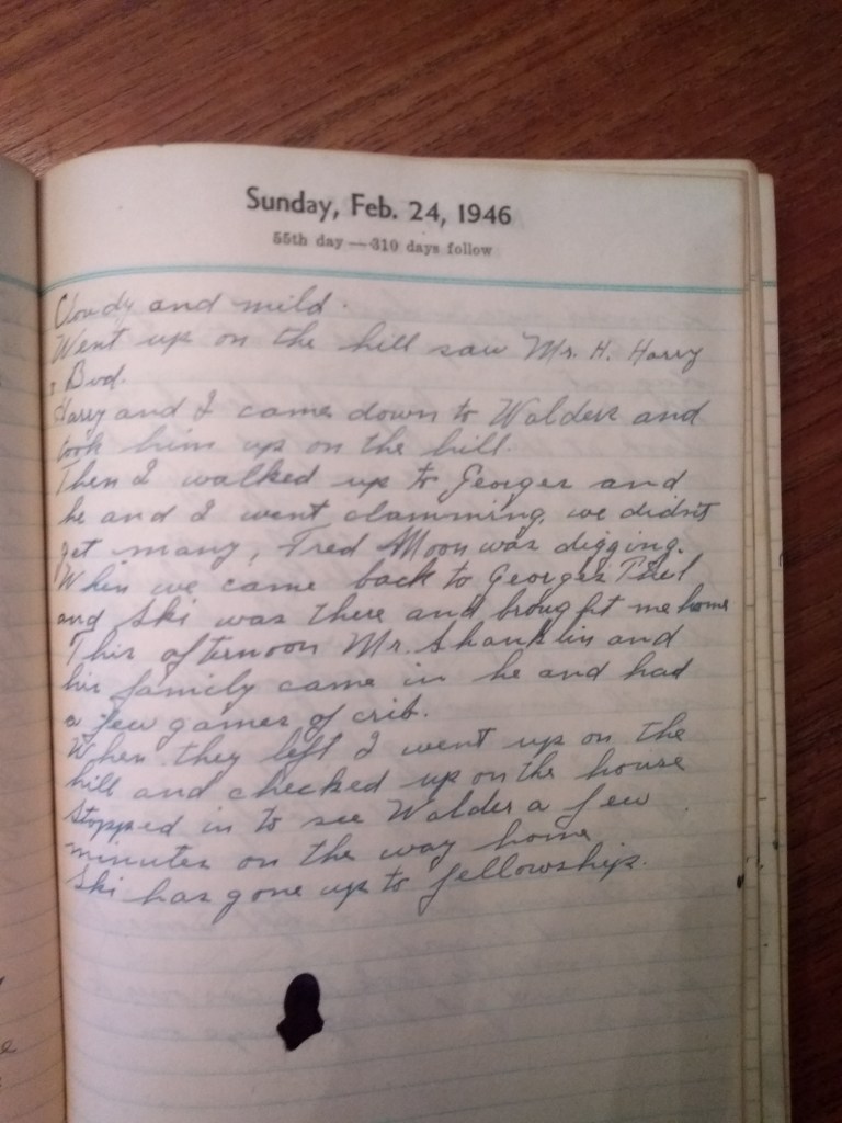 Then I walked up to Georges and he and I went clamming, we didn’t get many. Fred Moon was digging.