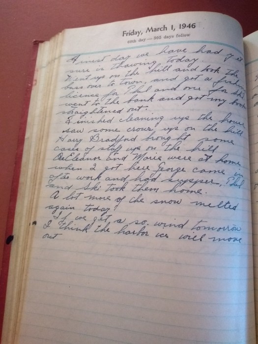 Went up on the hill and took the bus over to town, and got a fishing license for Thel and one for Ski. Went on to the bank and got my books straightened out.