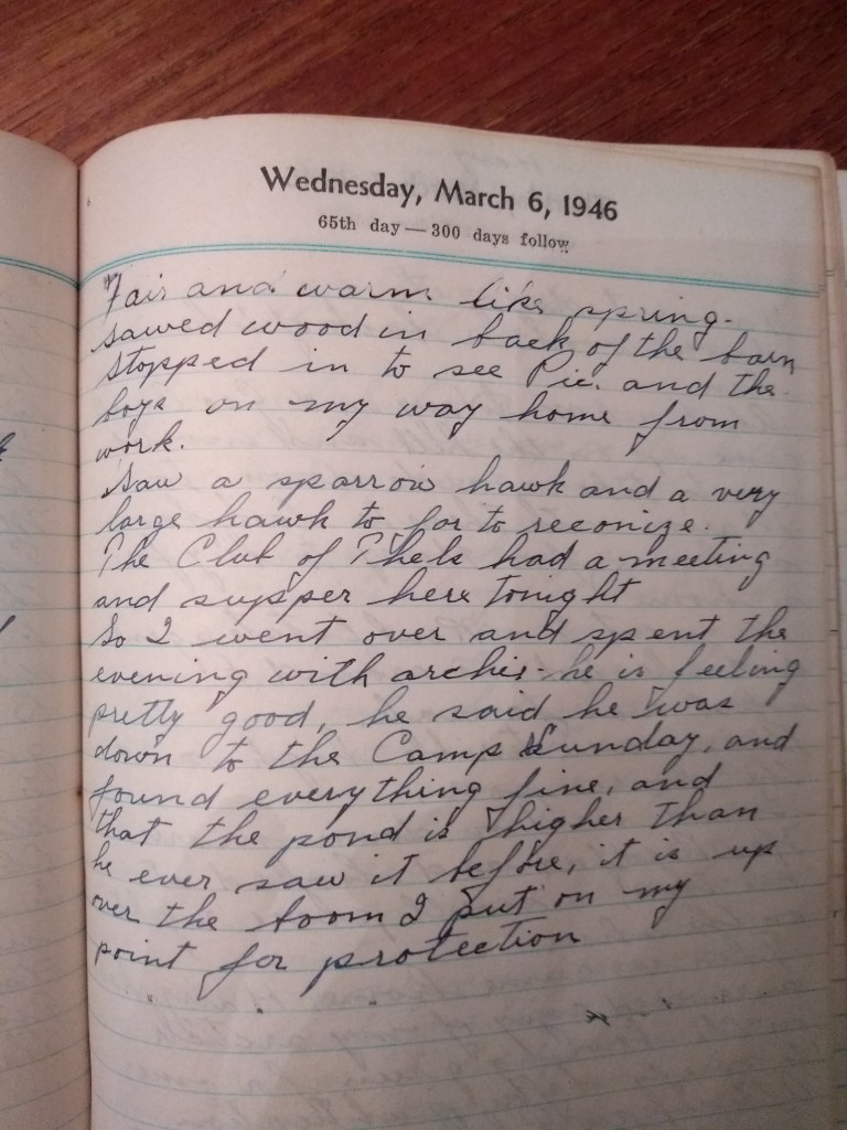 So I went over and spent the evening with Archie. He is feeling pretty good, he said he was down to the camp Sunday and found everything fine, and that the pond is higher than he ever saw it before. It is up over the boom (?) I put on my point for protection.