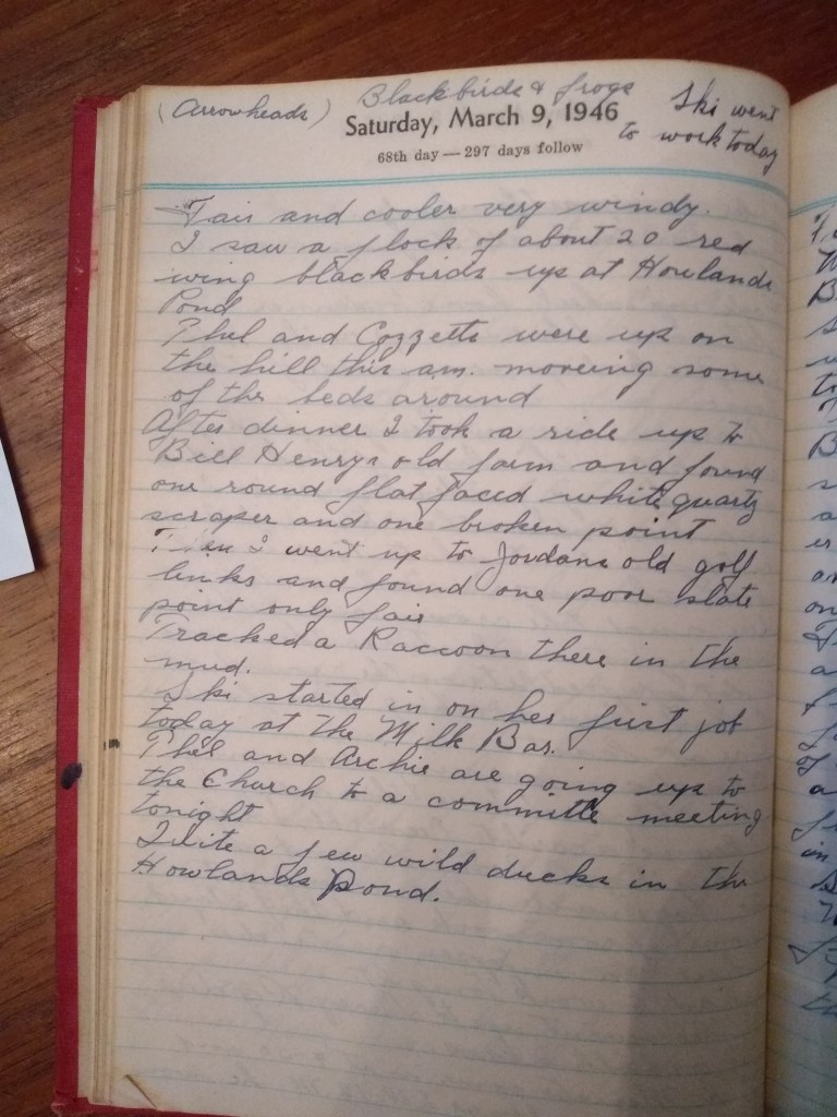 After dinner I took a ride up to Bill Henrys old farm and found one round flat faced white quartz scraper and one broken point. Then I went up to Jordans old golf links and found one poor slate point only fair.