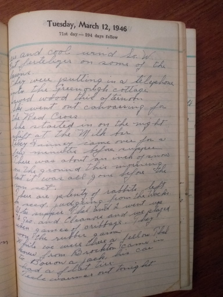 After supper Thel and I went up to Geo. and Eleanors and we played seven games of cribbage. They won the rubber game.