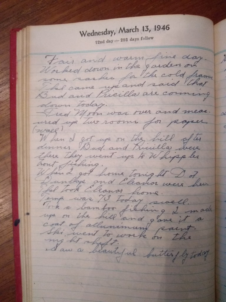 When I got up on the hill after dinner Bud and Priscilla were there. They went up to Whipples trout fishing.