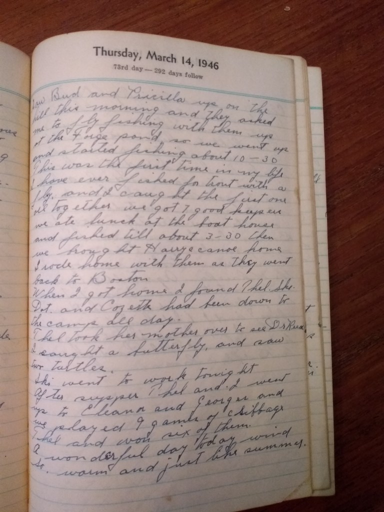 Saw Bud and Priscilla up on the hill this morning and they asked me to go fly fishing with them up at the Forge pond, so we went up and started fishing about 10:30. This was the first time in my life I have ever fished for trout with a fly and I caught the first one. All together we got 7 good keepers. We ate lunch at the boat house and fished till about 3:30 then we brought Harry’s canoe home. I rode home with them and they went back to Boston.