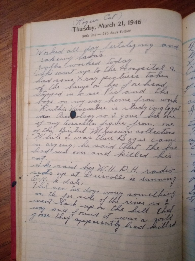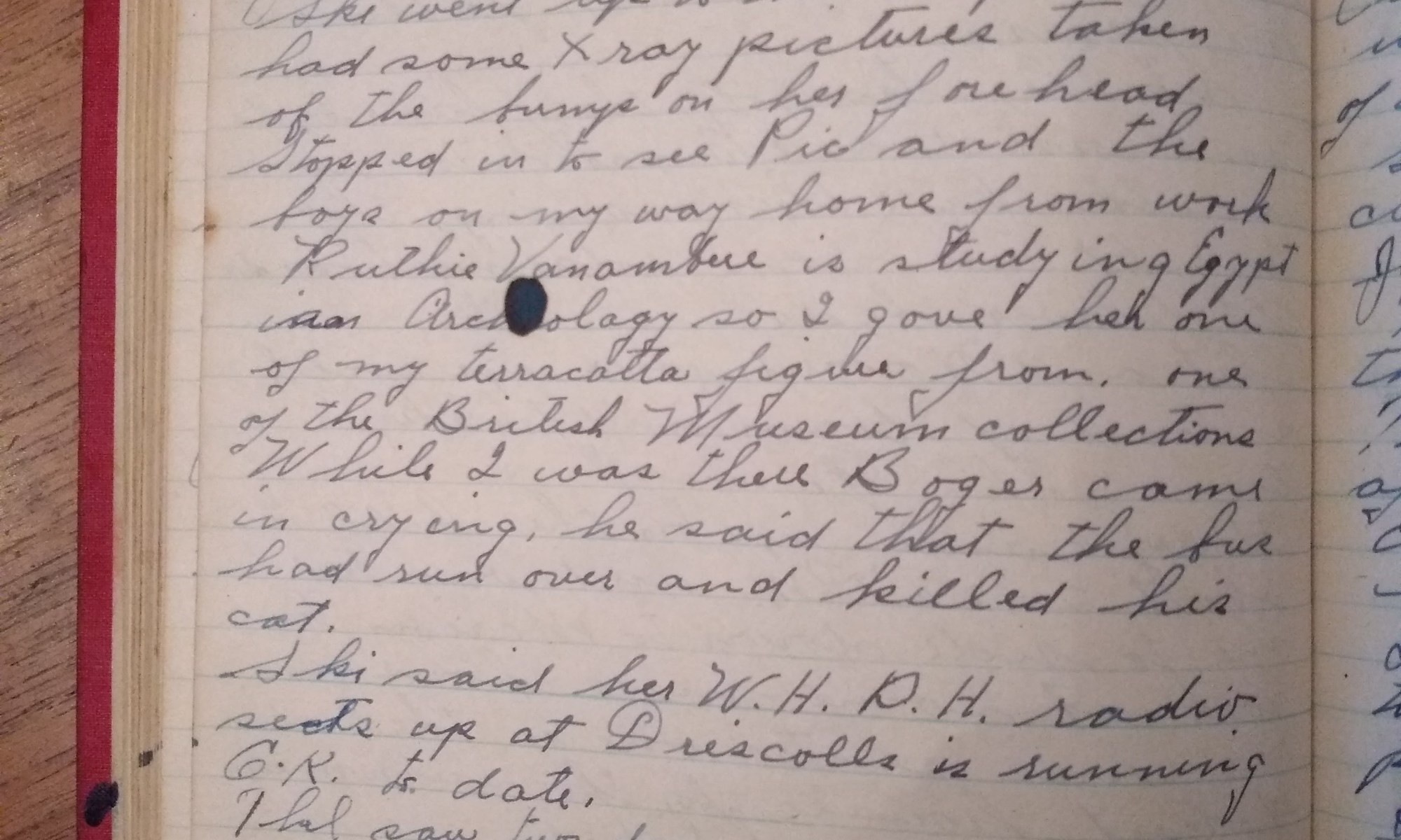 Ruthie Vanamberg is studying Egypt Archeology so I gave her one of my terracotta figures from one of the British Museum collections. While I was there Roger came in crying, he said that the bus had run over and killed his cat.