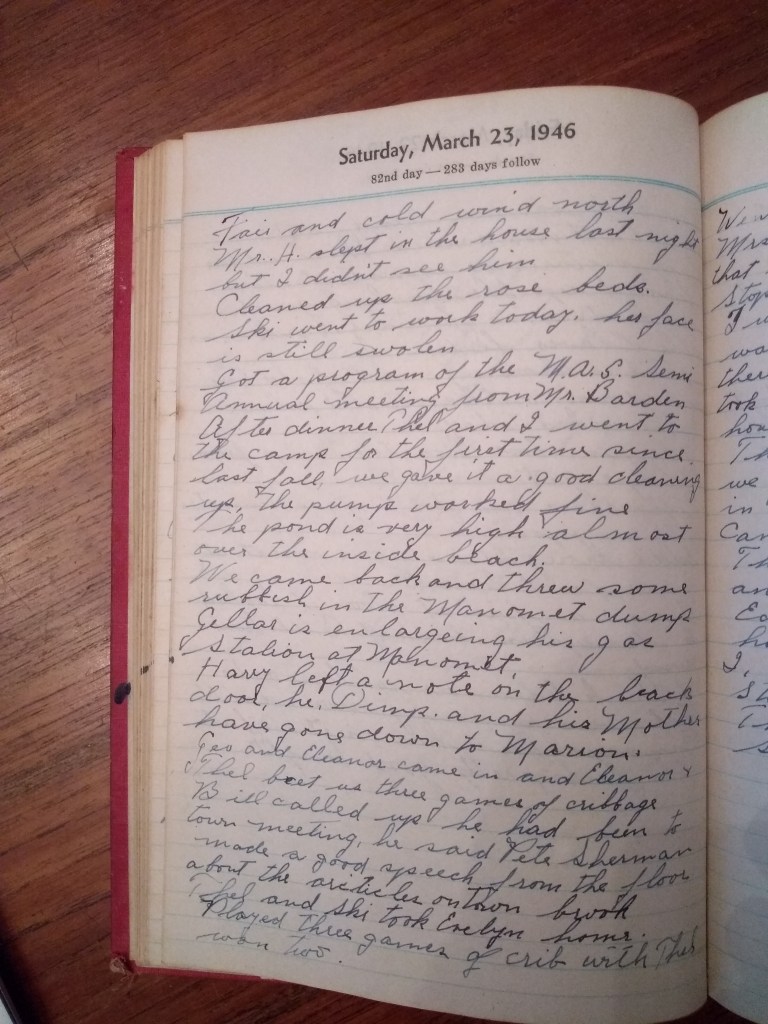George and Eleanor came in and Eleanor and Thel beat us three games of cribbage. Bill called up. He had been to town meeting. He said Pete Sherman made a good speech from the floor about the articles on Town Brook.
