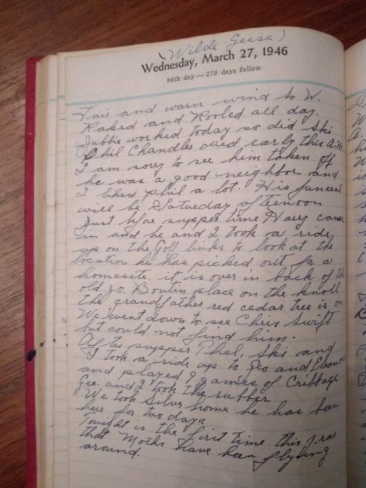 Phil Chandler died early this A.M> I am sorry to see him taken off. He was a good neighbor and I liked Phil a lot. His funeral will be Saturday afternoon.