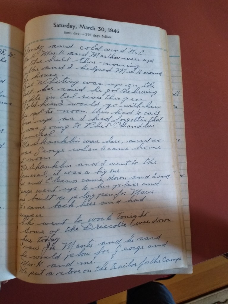 Bill Whiting was up on the hill. He said he got the herring rights in Eel River this year. I told him I would go with him this afternoon, then had to call him up as I had forgotten that I was going to Phil Chandlers funeral.
