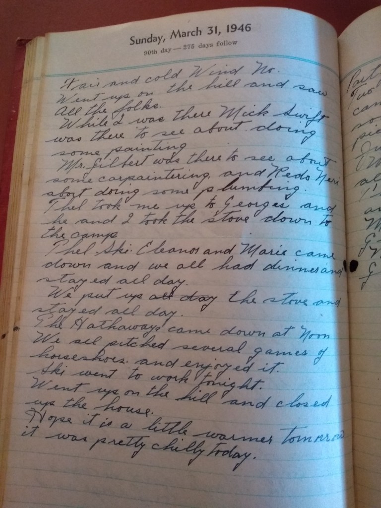 Thel, Ski, Eleanor, and Marie came down and we all had dinner and stayed all day. We put up the stove and stayed all day. The Hathaways came down at noon.