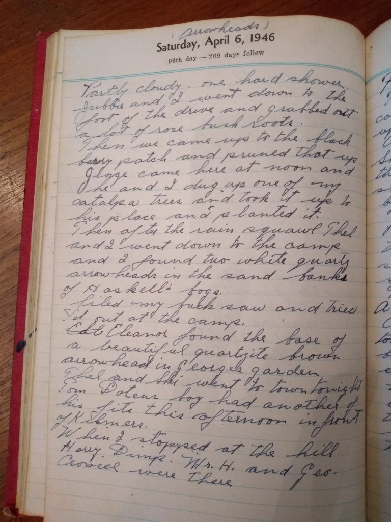 Then we came up to the black berry patch and pruned that up. George came here at noon and he and I dug up one of my catalpa trees and took it up to his place and planted it. Then after the rain squall Thel and I went down to the camp and I found two white quartz arrowheads in the sand banks of Haskell’s bogs.