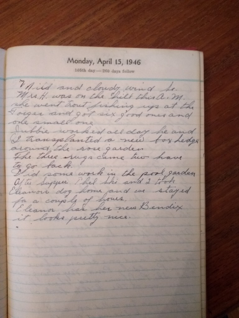 Mrs. H. was on the hill this A.M. she went trout fishing up at the Forges and got six good ones and one small one.