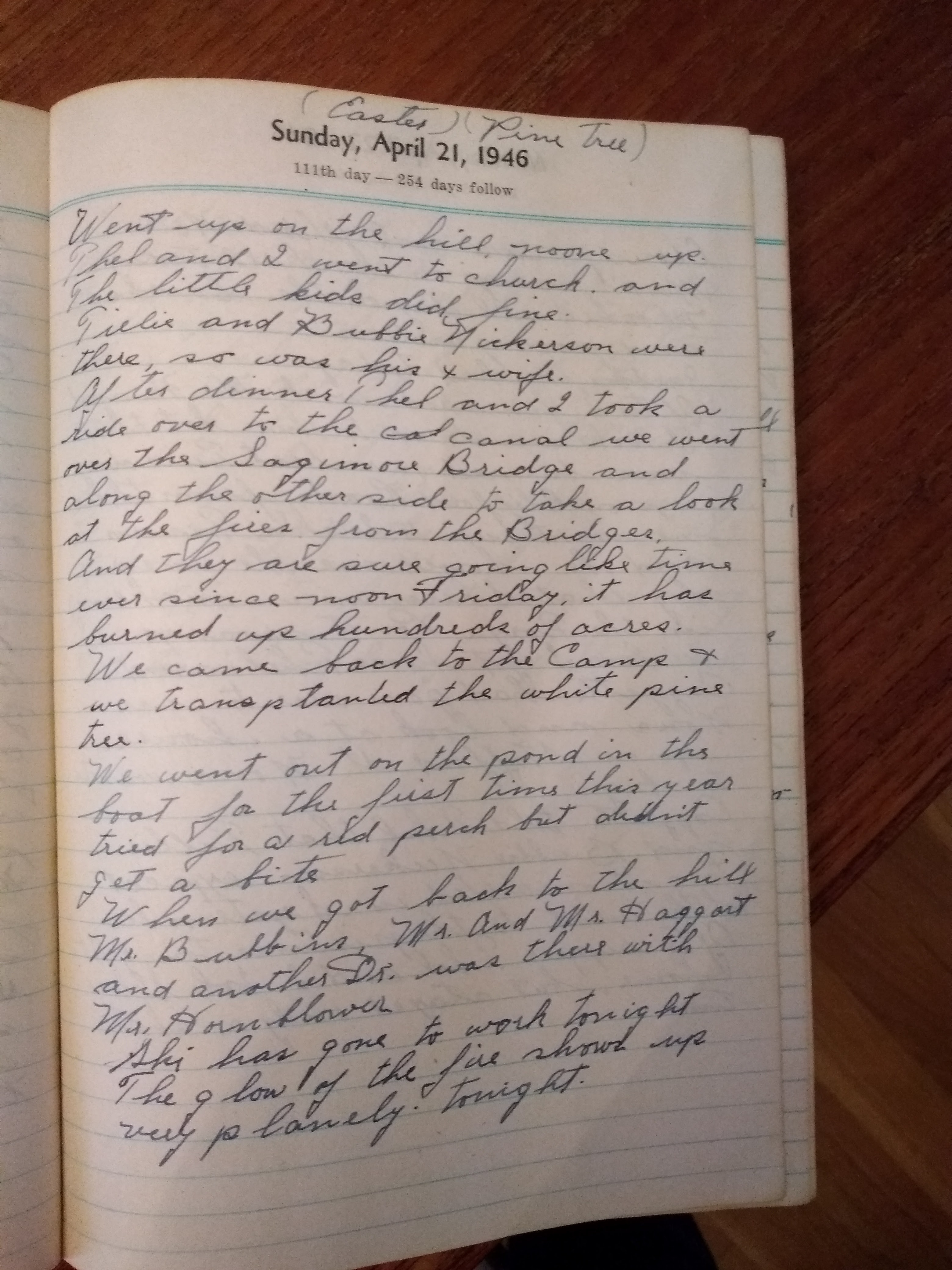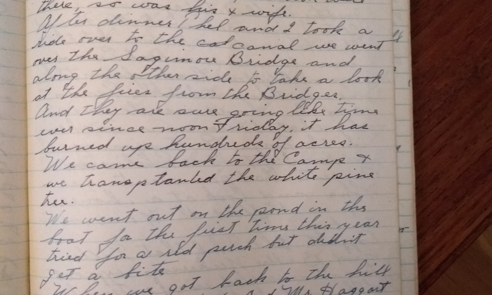 After dinner Thel and I took a ride over to the canal. We went over the Sagamore Bridge and along the other side to take a look at the fires from the Bridges. And they are sure going like time every since noon Friday. It has burned up hundreds of acres. We came back to the camp and we transplanted the white pine tree.