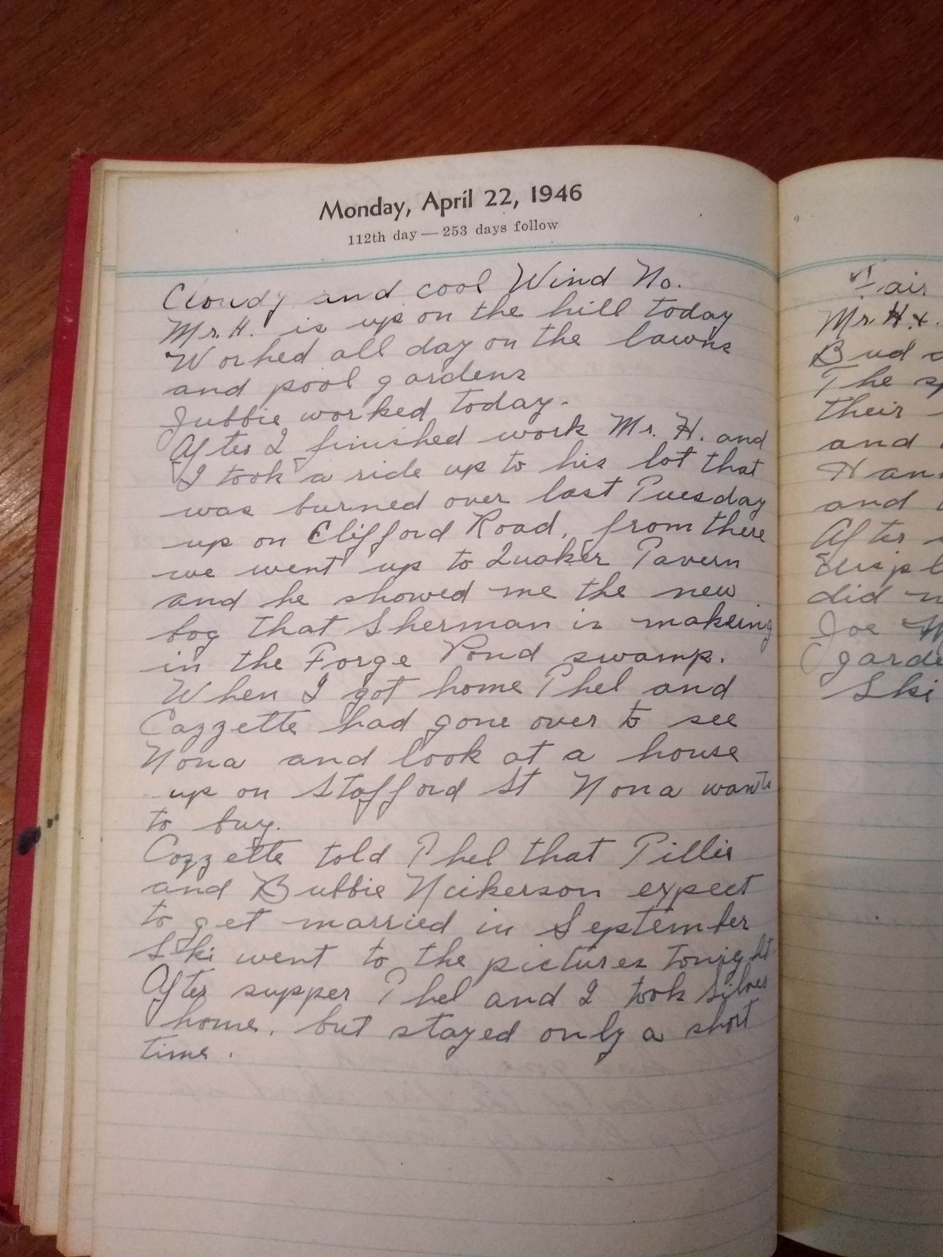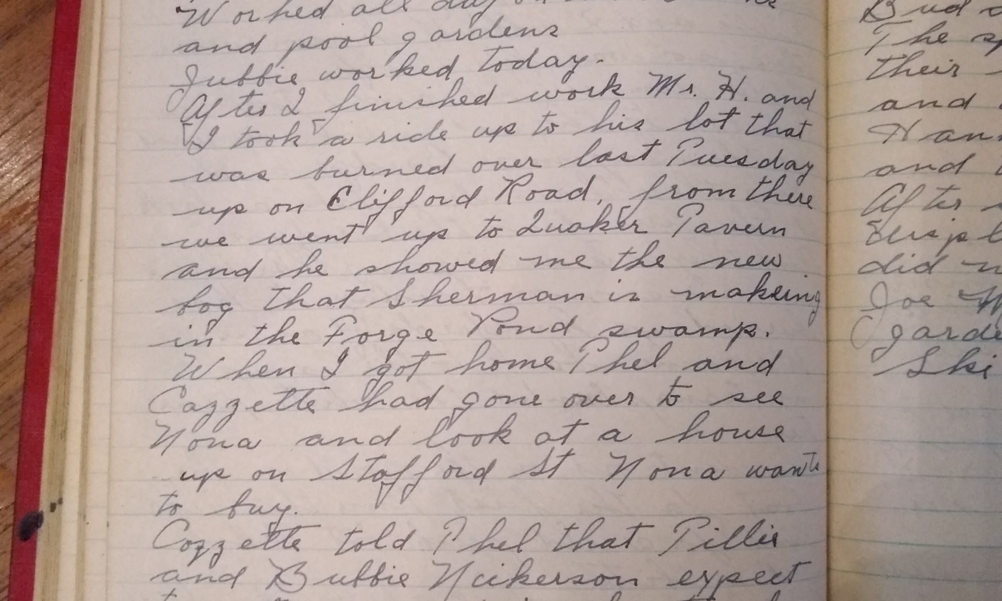 After I finished work Mr. H. and I took a ride up to his lot that was burned over last Tuesday up on Clifford Toad, from there we went up to Quaker Tavern and he showed me the new bog that Sherman is making in the Forge Pond swamp.