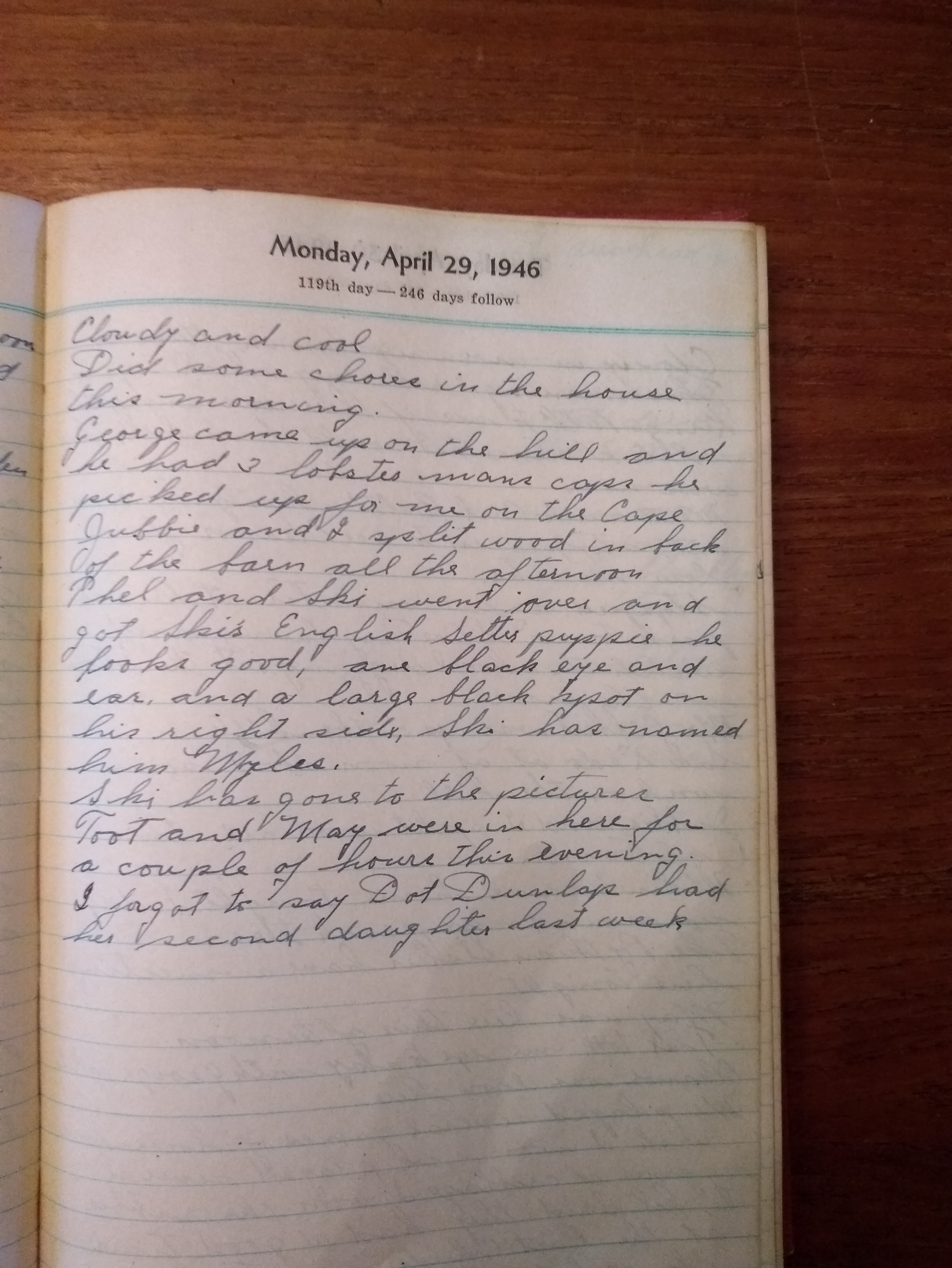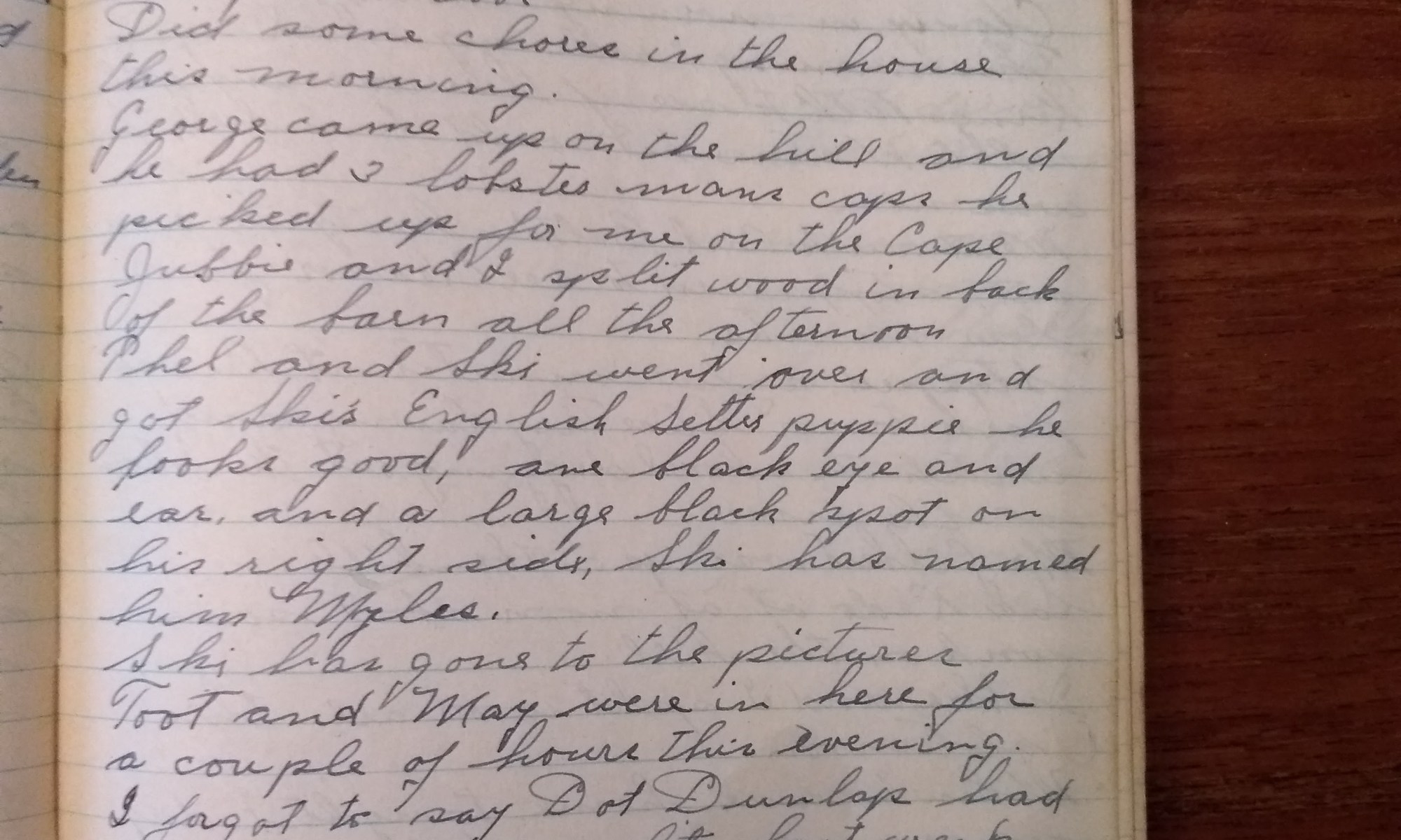 Thel and Ski went over and got Ski’s English Setter puppy. He looks good, one black eye and ear, and a large plack spot on his right side. Ski has named him Myles.