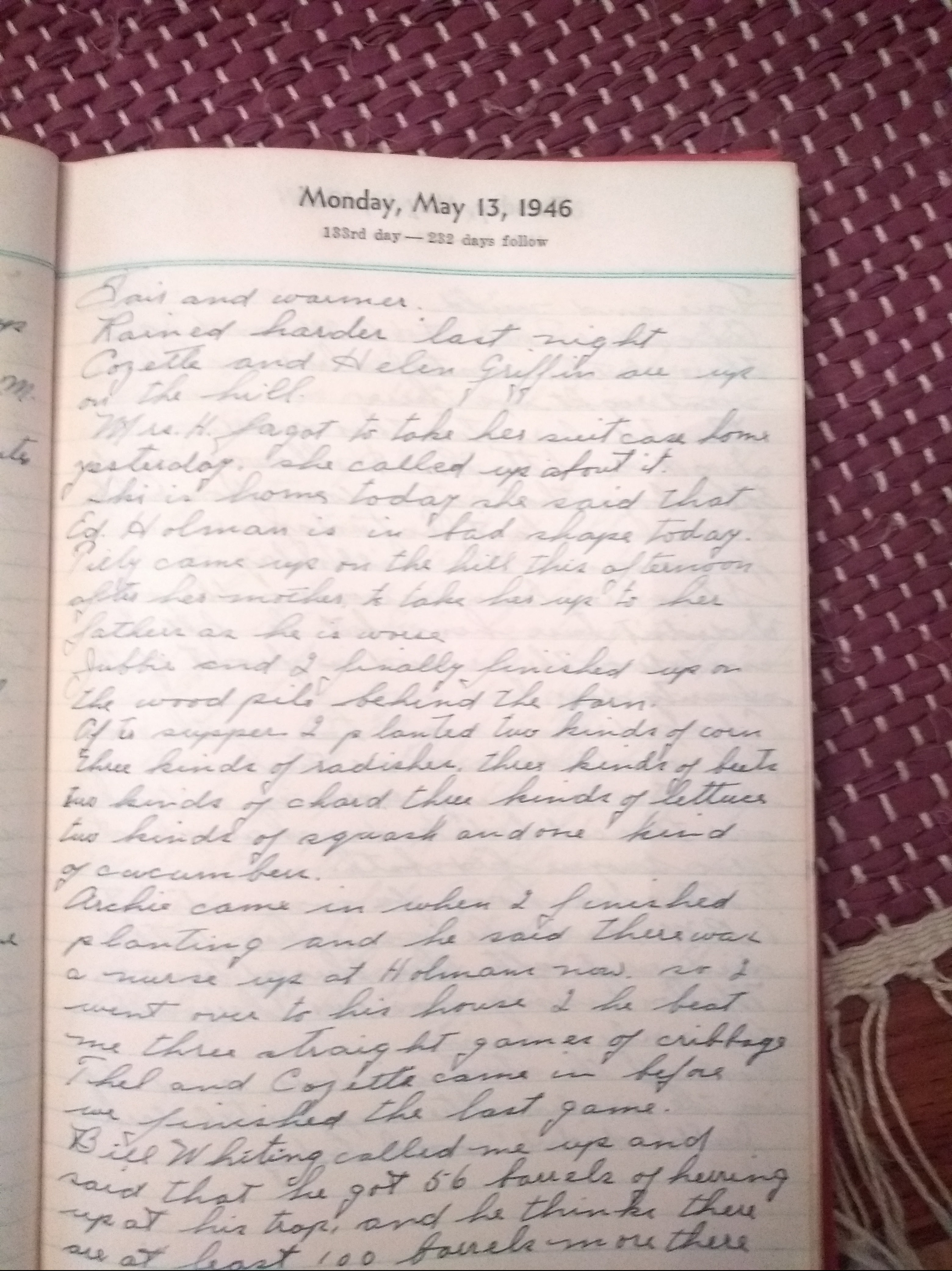 Archie came in when I finished planting and he said there was up at Holmans now so I went over to his house and he beat me three straight games of cribbage. Thel and Cozette came in before we finished the last game.