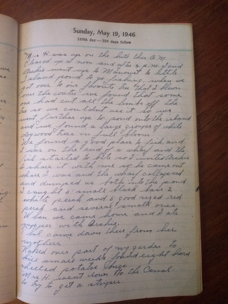 Mrs. H. was up on the hill this A.M. Cleared up at noon and after 4 P.M. Archie and I went up to Manomet to Little Island Pond to go fishing. When we got over to our favorite tree that had blown {down} over the water we found that some one had cut all the limbs off the tree so we couldn’t use it, so we sent further up the pond onto the island and we found a large group of white dogwood trees in full bloom.