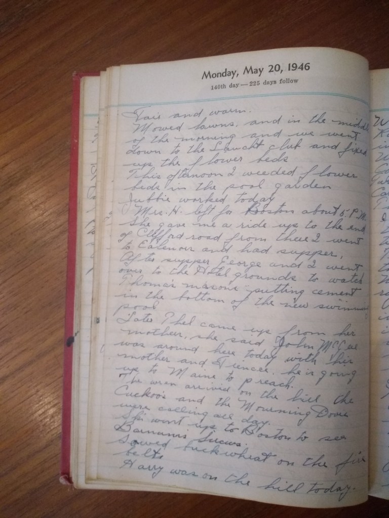 Mrs. H. left for Boston about 5 P.M. She gave me a ride up to the end of Clifford Road. From there I went to Eleanors and had supper. After supper George and I went over to the Hotel grounds to watch Thomas’ masons putting cement in the bottom of the new swimming pool.