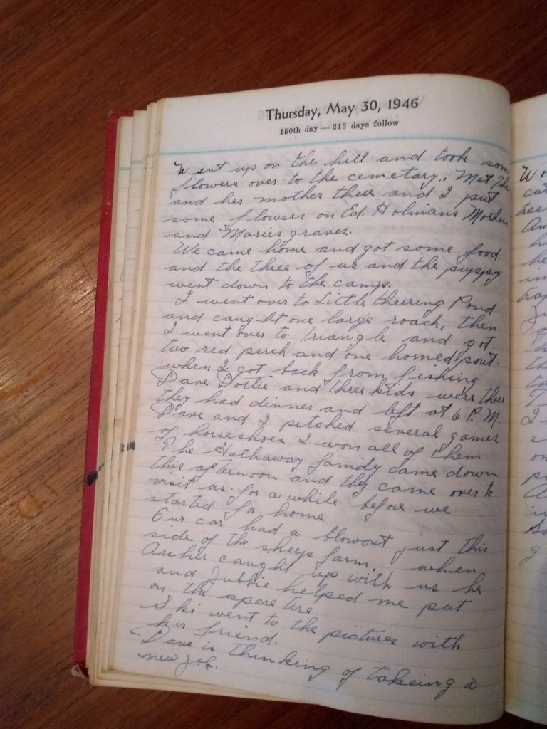 Went up on the hill and took some flowers over to the cemetery. Met Thel and her mother there and I put some flowers on Ed Holman’s, Mother’s, and Marie’s graves.