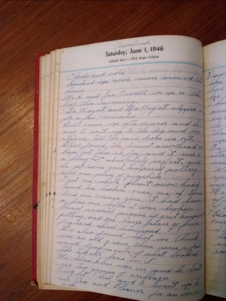 Bill came up after dinner and he and I went up to the dig and we stayed till the rain drove us out. Bill found the finest arrowhead we have gotten there so far and it sure was a honey..absolutely perfect, and he got some grit tempered pottery and one piece of graphite.