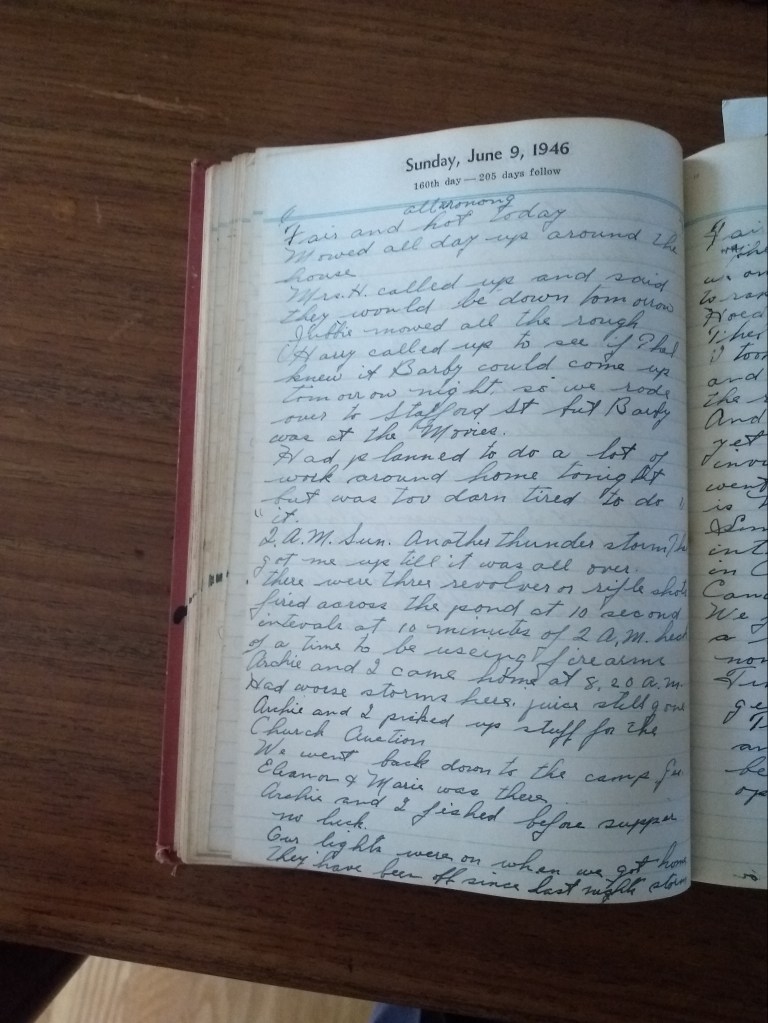 2 A.M. Sunday. Another thunder storm. Thel got me up till it was all over. There were three revolver or rifle shots fired across the pond at 10 second intervals at 10 minutes to 2 A.M. Heck of a time to be using firearms.