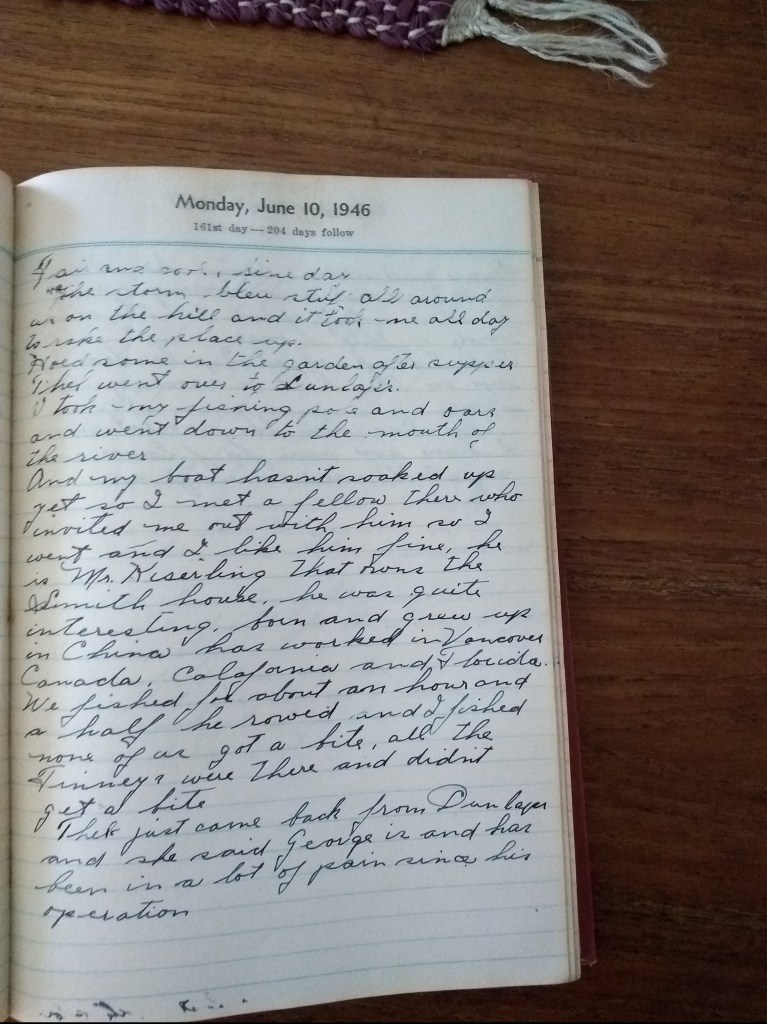 I took my fishing pole and oars and went down to the mouth of the river. And my boat hasn’t soaked up yet so I met a fellow there who invited me out with him, so I went and I like him fine. He is Mr. Kiserling that owns the Smith house. He was quite interesting, born and grew up in China, has worked in Vancouver, Canada, California, and Florida. We fished for about an hour and a half. He rowed and I fished, none of us got a bite. All the Finneys were there and didn’t get a bite.