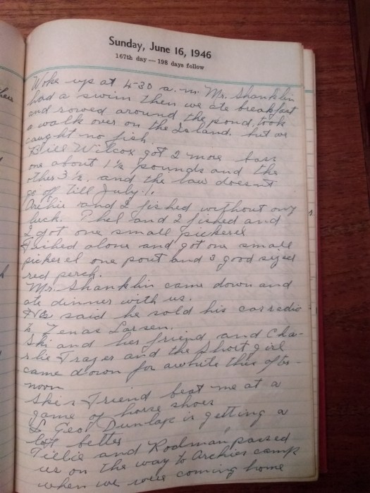 Woke up at 4:30 A.M. Mr. Mr. Shanklin had a swim then we ate breakfast and rowed around the pond, took a walk over on the island, but we caught no fish.