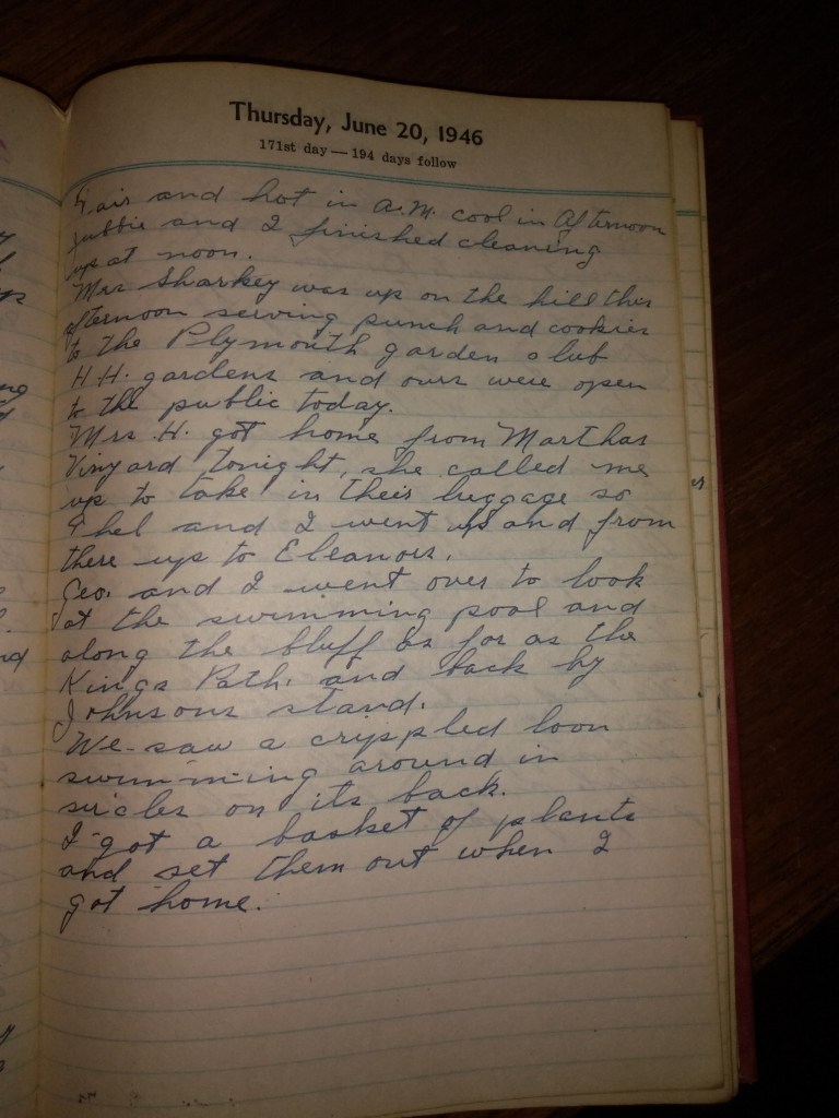 Mrs. H. got home from Martha’s Vineyard tonight. She called me up to take in their luggage so Thel and I went up and from there up to Eleanor’s.