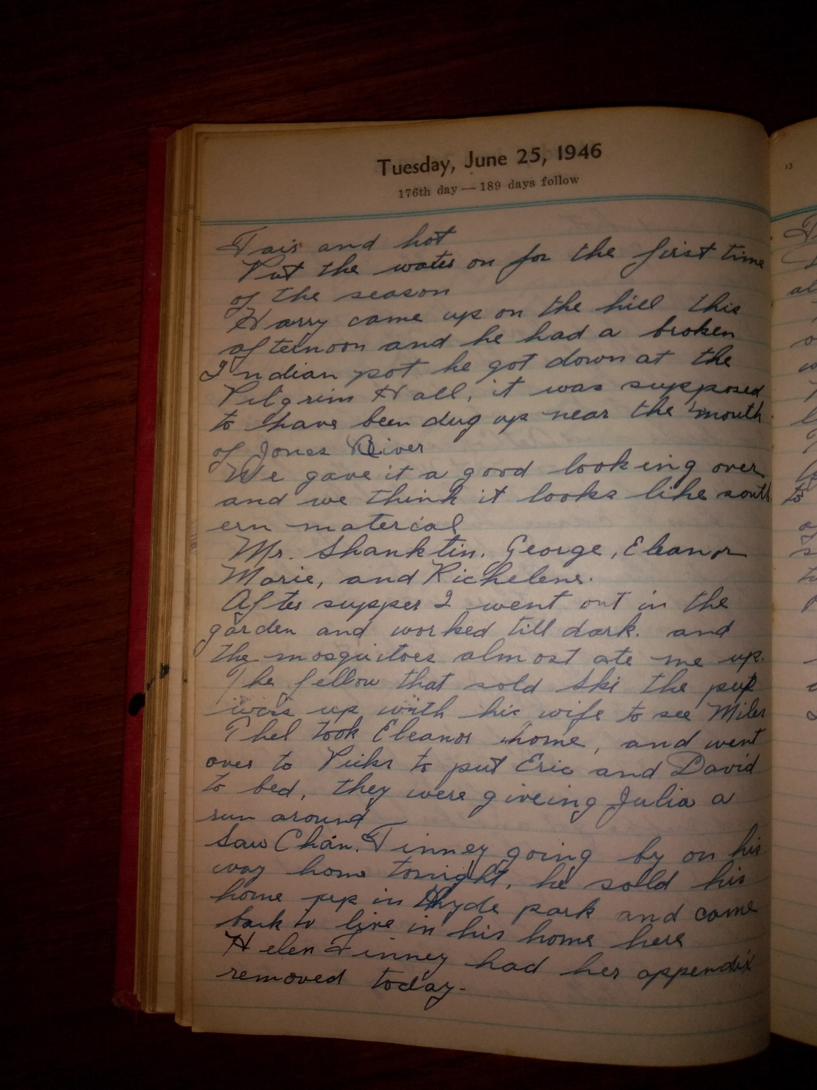 Harry came up on the hill this afternoon and he had a broken Indian pot he got down at the Pilgrim Hall. It was supposed to have been dug up near the mouth of Jones River. We gave it a good looking over and we think it looks like southern material.