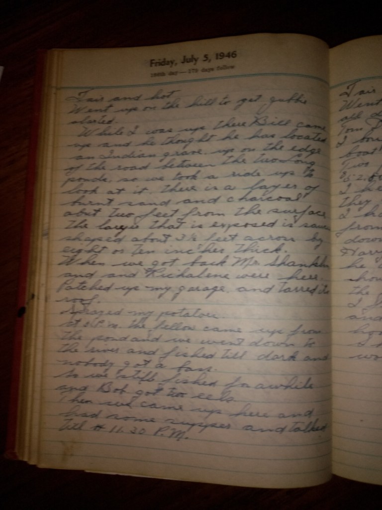 At P.M. the fellow came up from the pond and we went down to the river and fished till dark and nobody got a bass. So we still fished for a while and Bob got two eels. Then we came up here and had some supper and talked till 11:30 P.M.