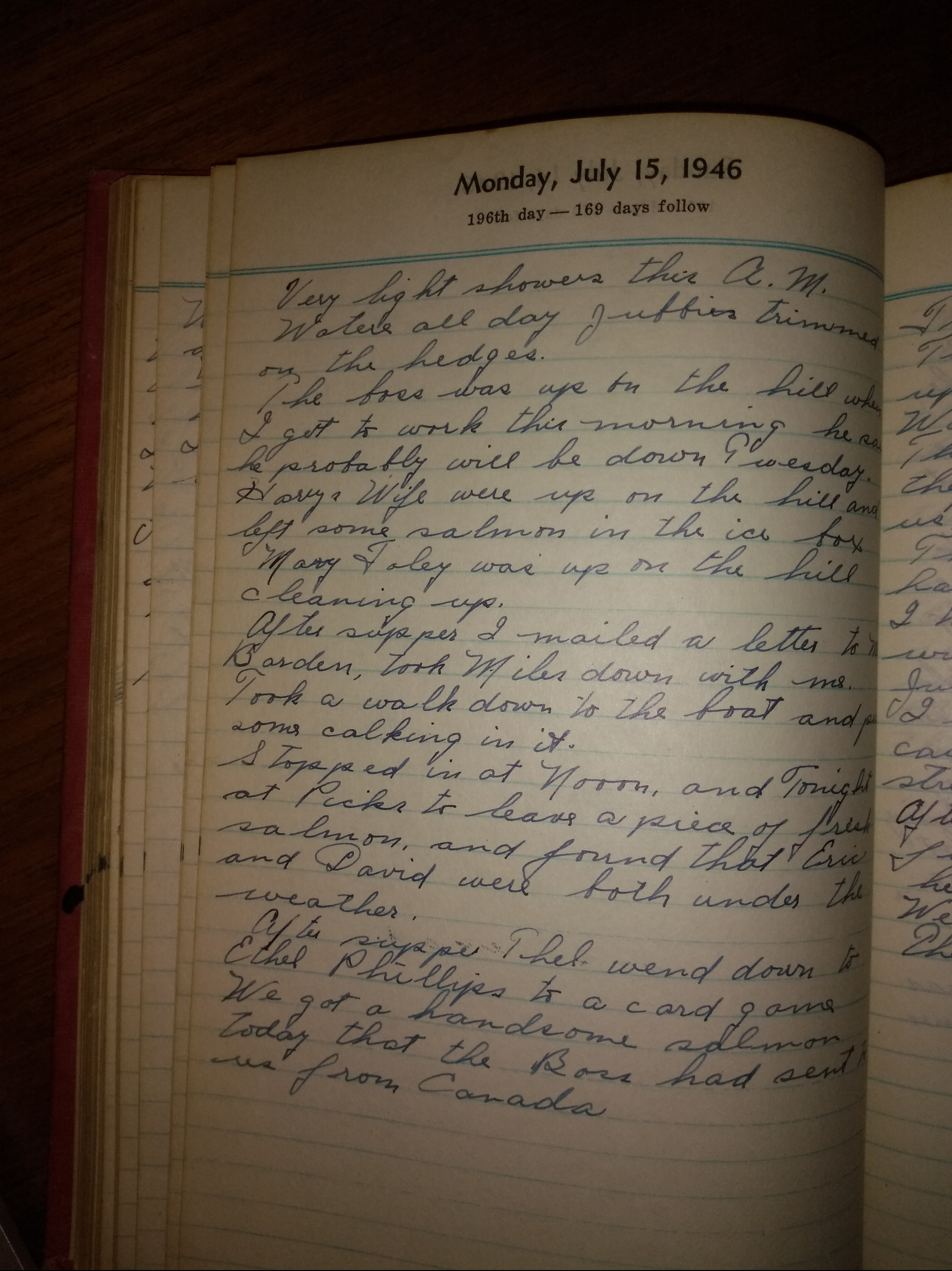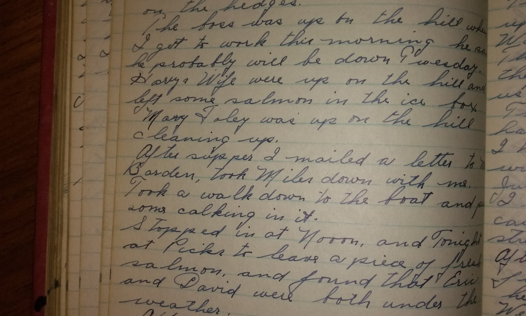 The boss was up on the hill when I got to work this morning. He said he probably will be down Tuesday. Harry and wife were up on the hill and left some salmon in the ice box.