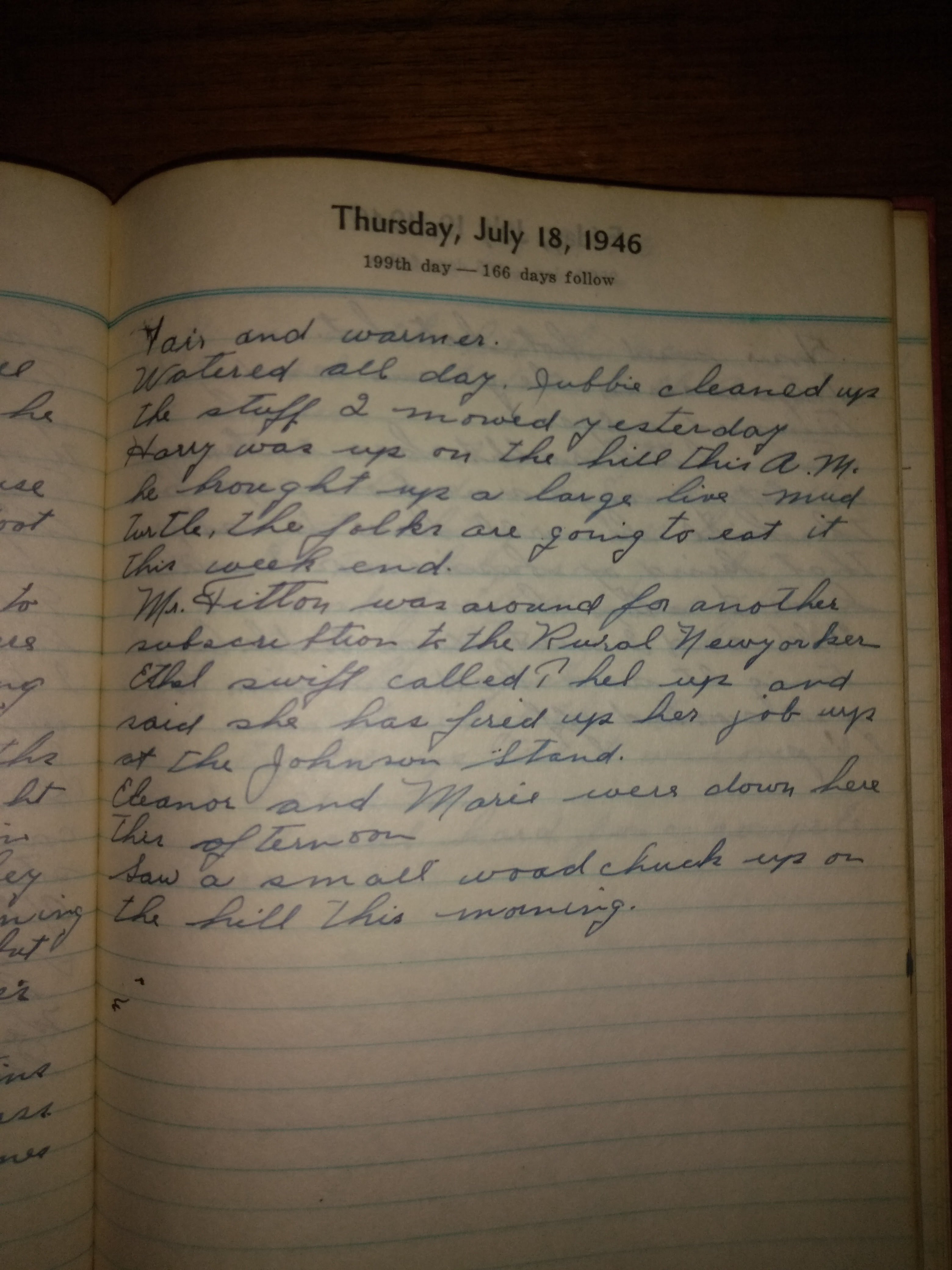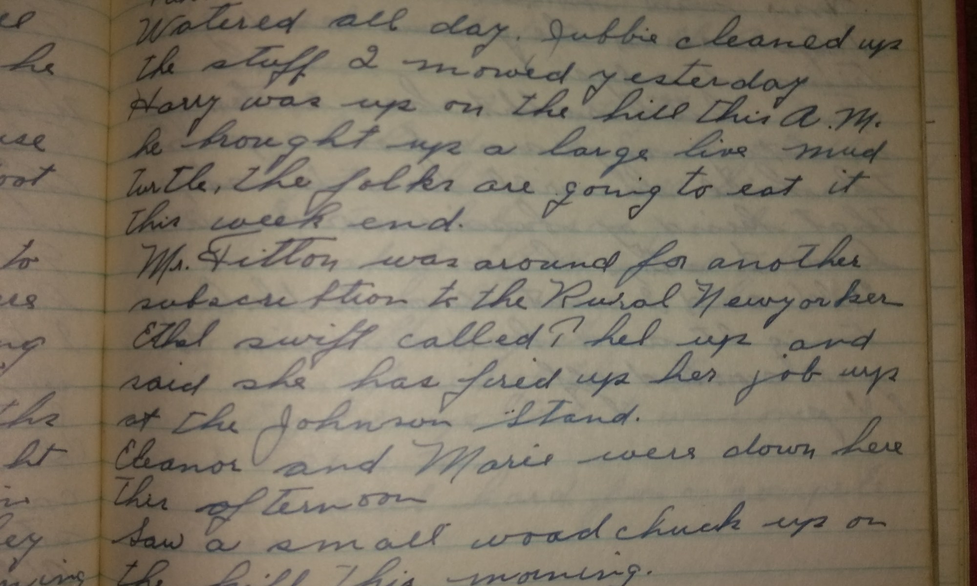Harry was up on the hill this A.M. He brought up a large live mud turtle, the folks are going to eat it this weekend.
