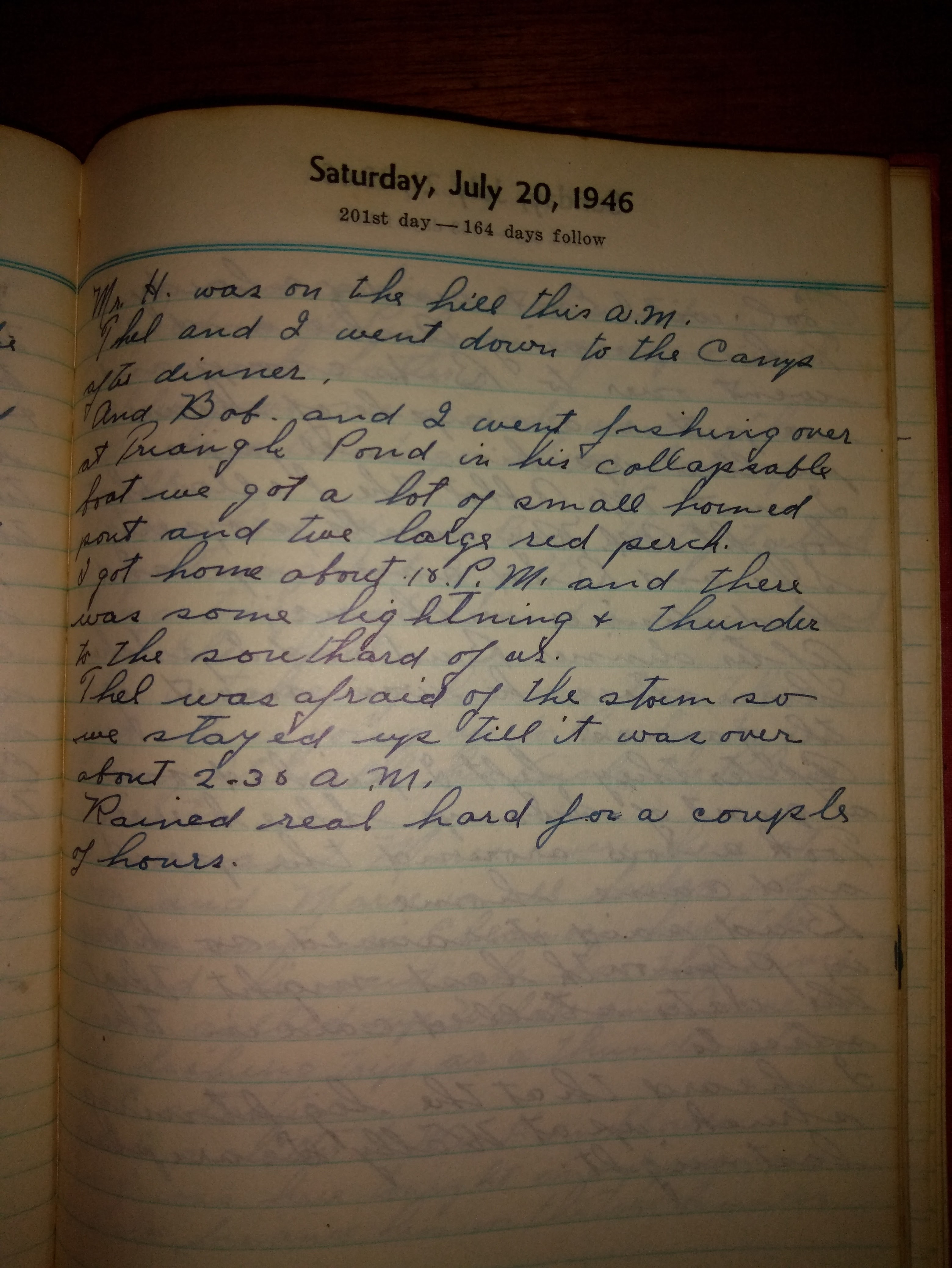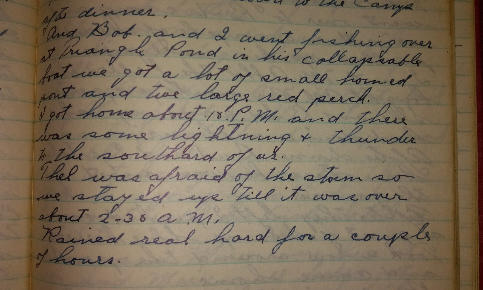 I got home about 10 P.M. and there was some lightning and thunder to the south of us. Thel was afraid of the storm so we stayed up till it was over about 2:30 A.M.