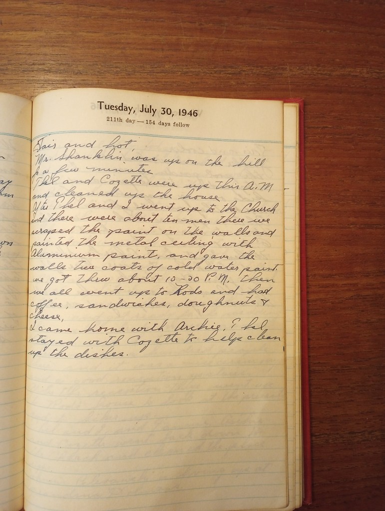 After Thel and I went up to the church and there were about ten men there. We scraped the paint on the walls and painted the metal ceiling with aluminum paint and gave the walls two coats of cold water paint. We got through about 10:30 P.M. Then we all went up to Rod’s and had coffee, sandwiches, doughnuts, and cheese.